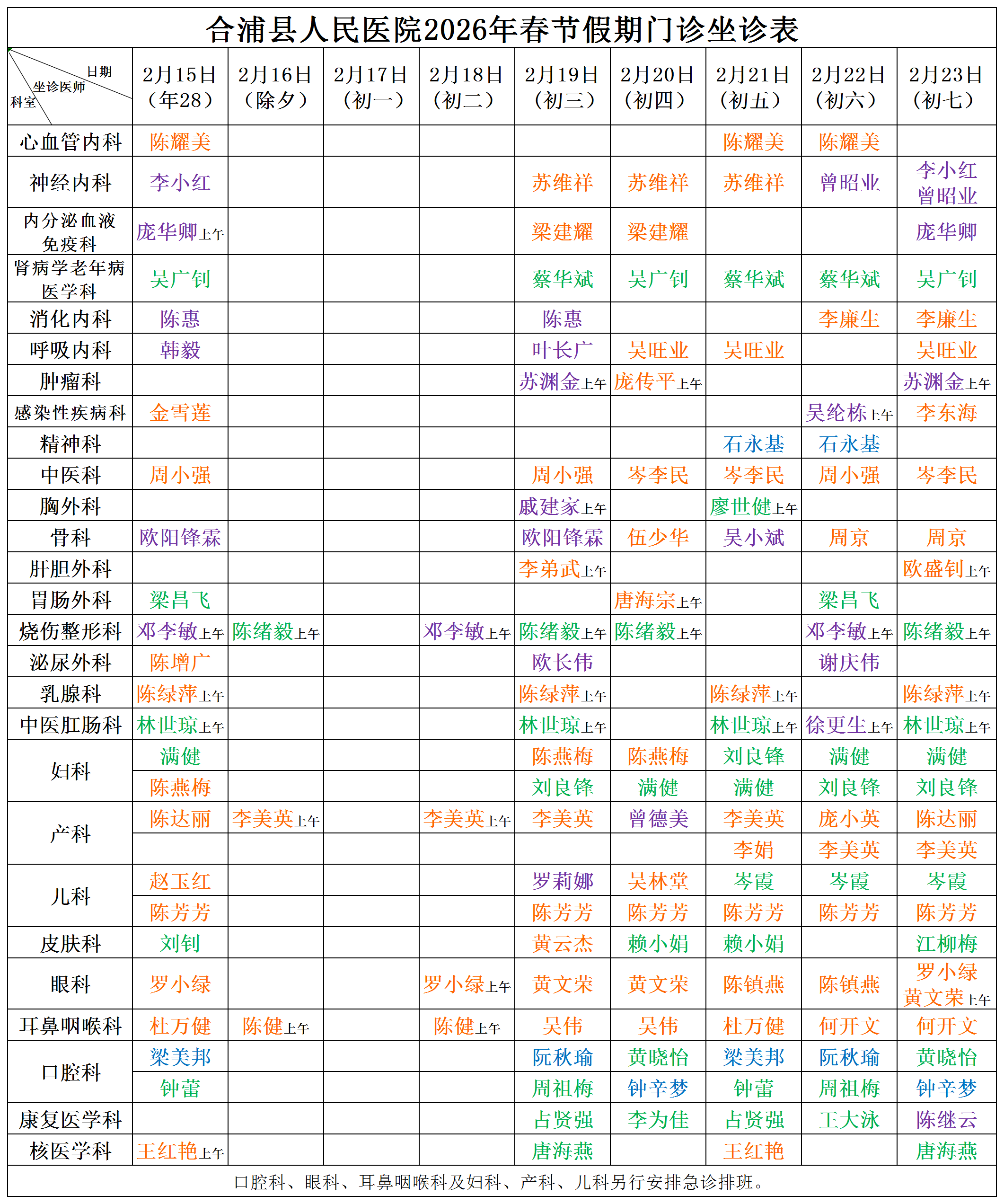 2026年春节假期门诊坐诊安排