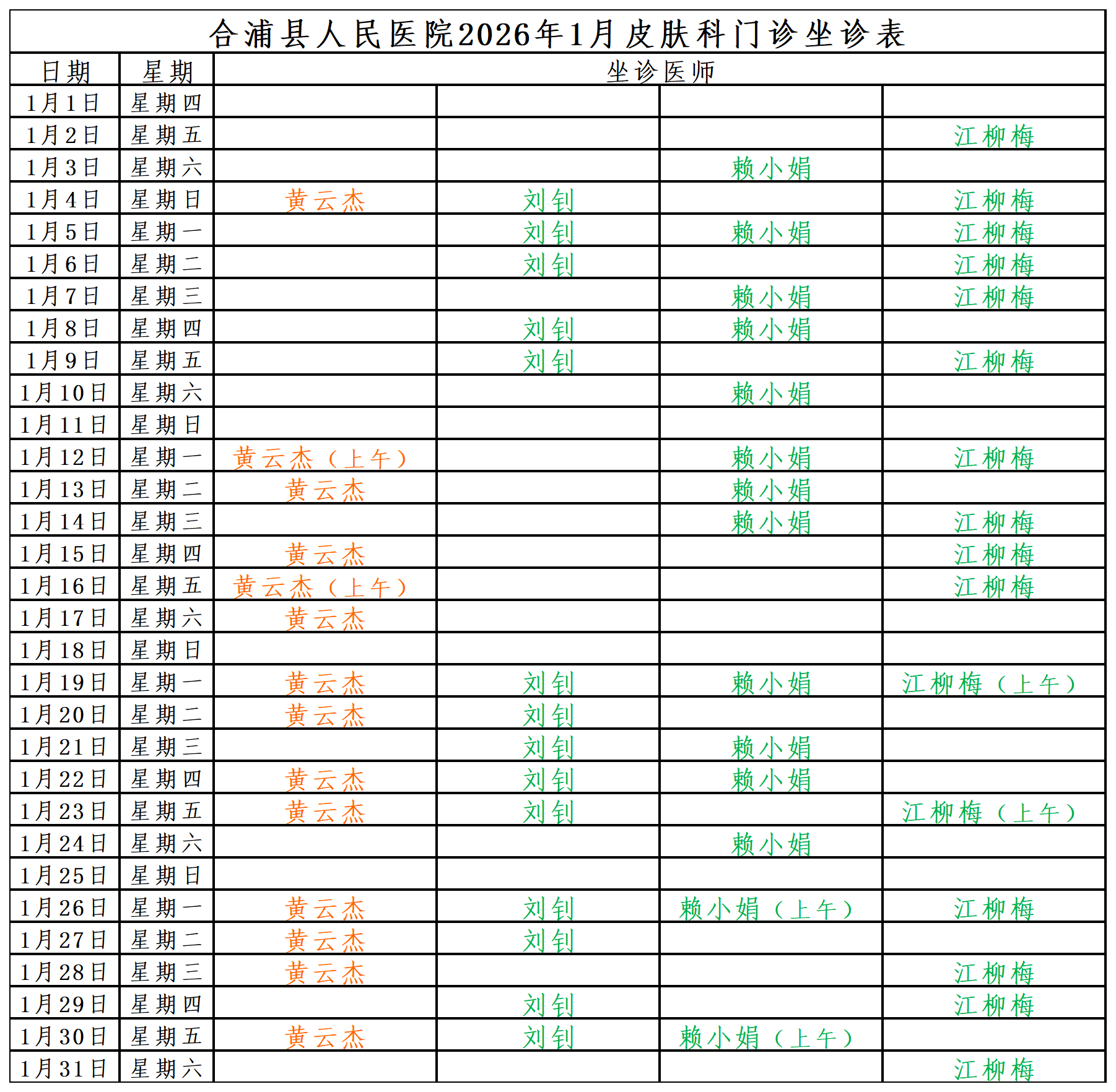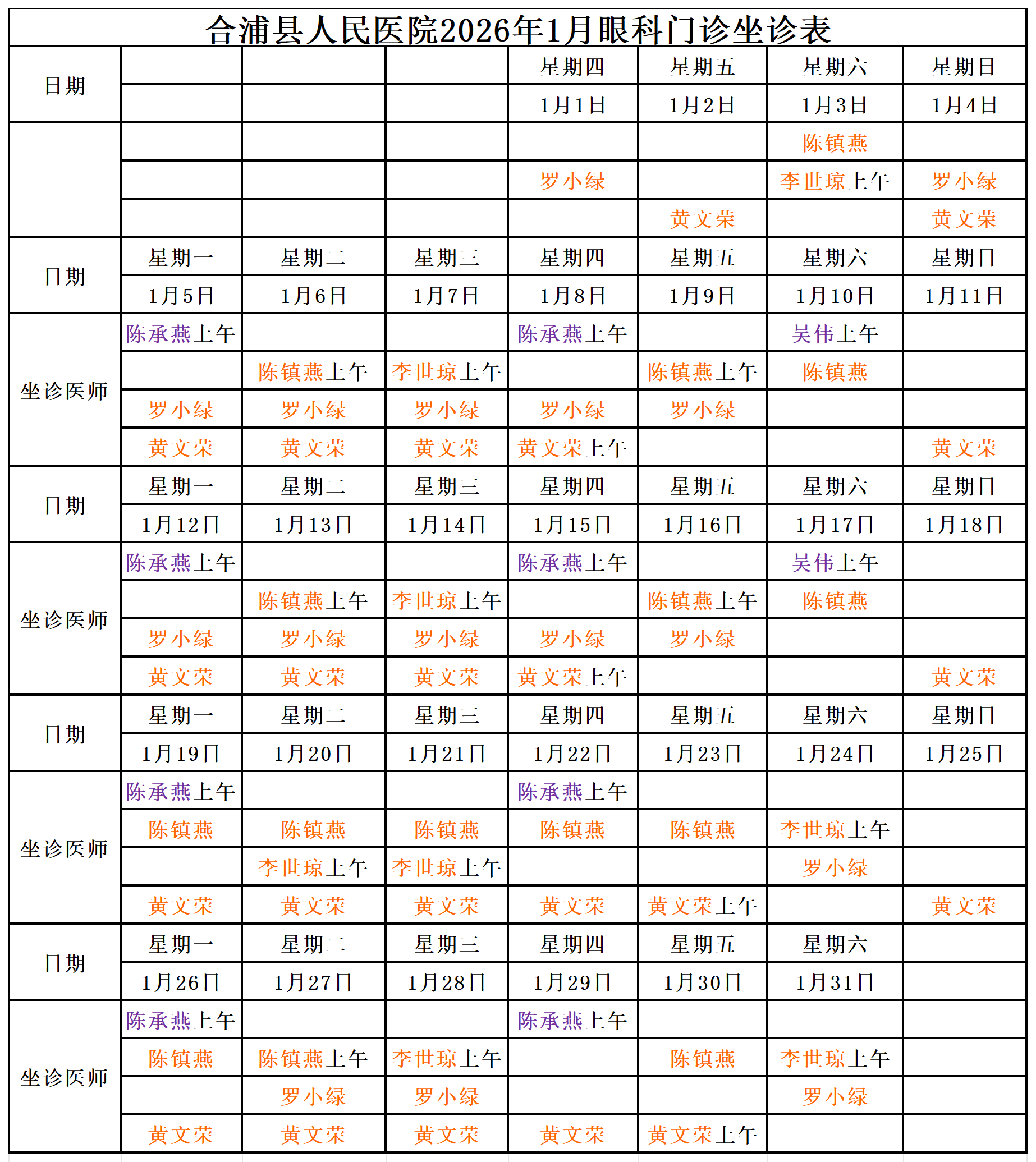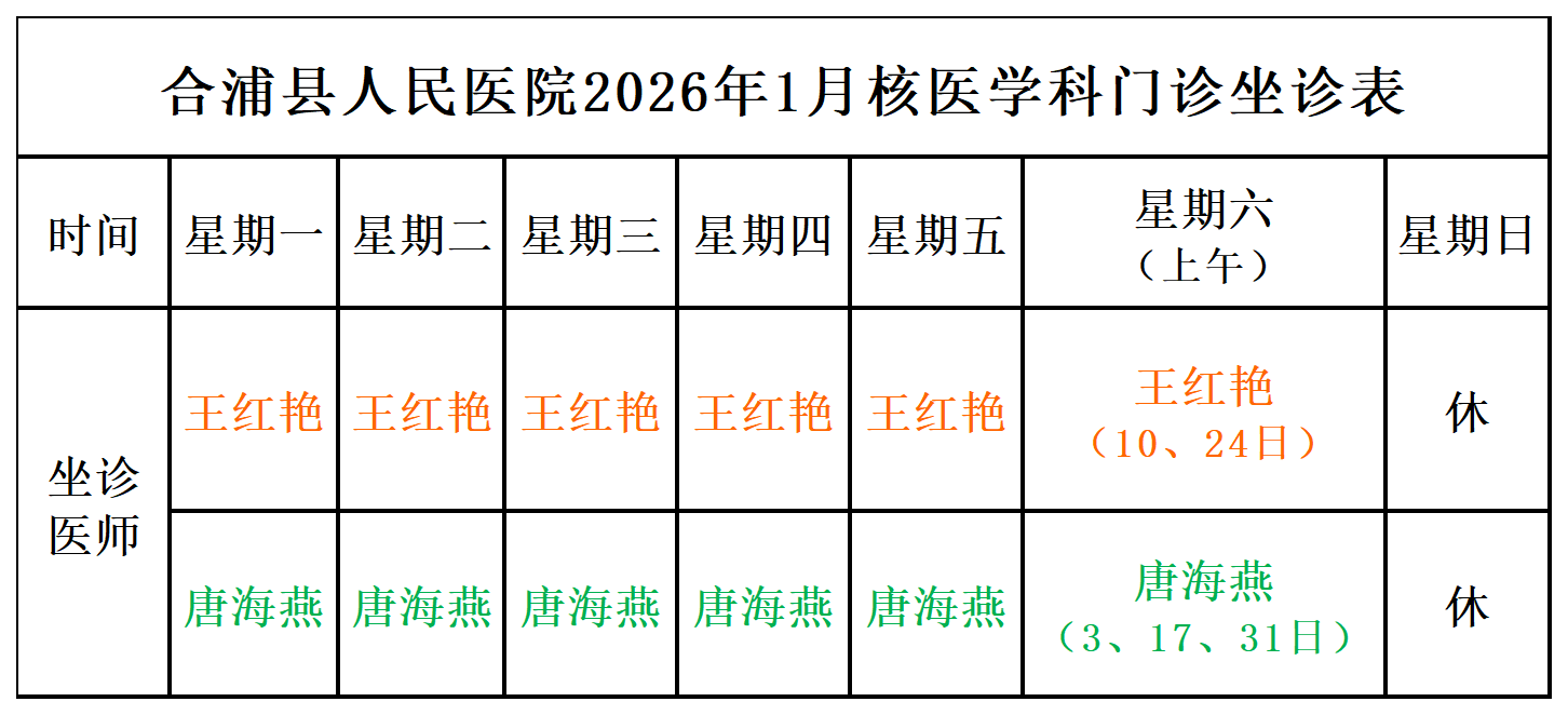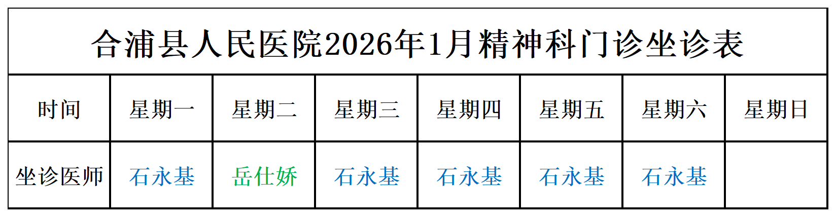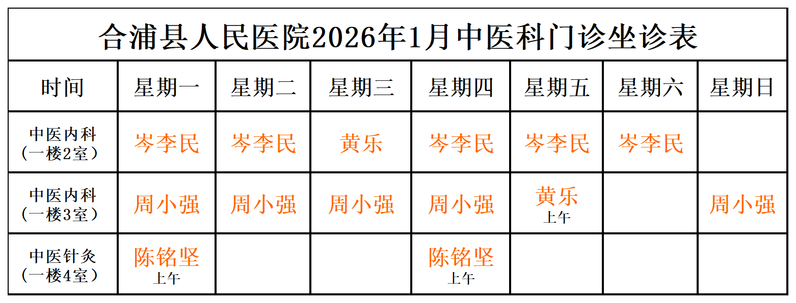 2026年1月门诊坐诊安排