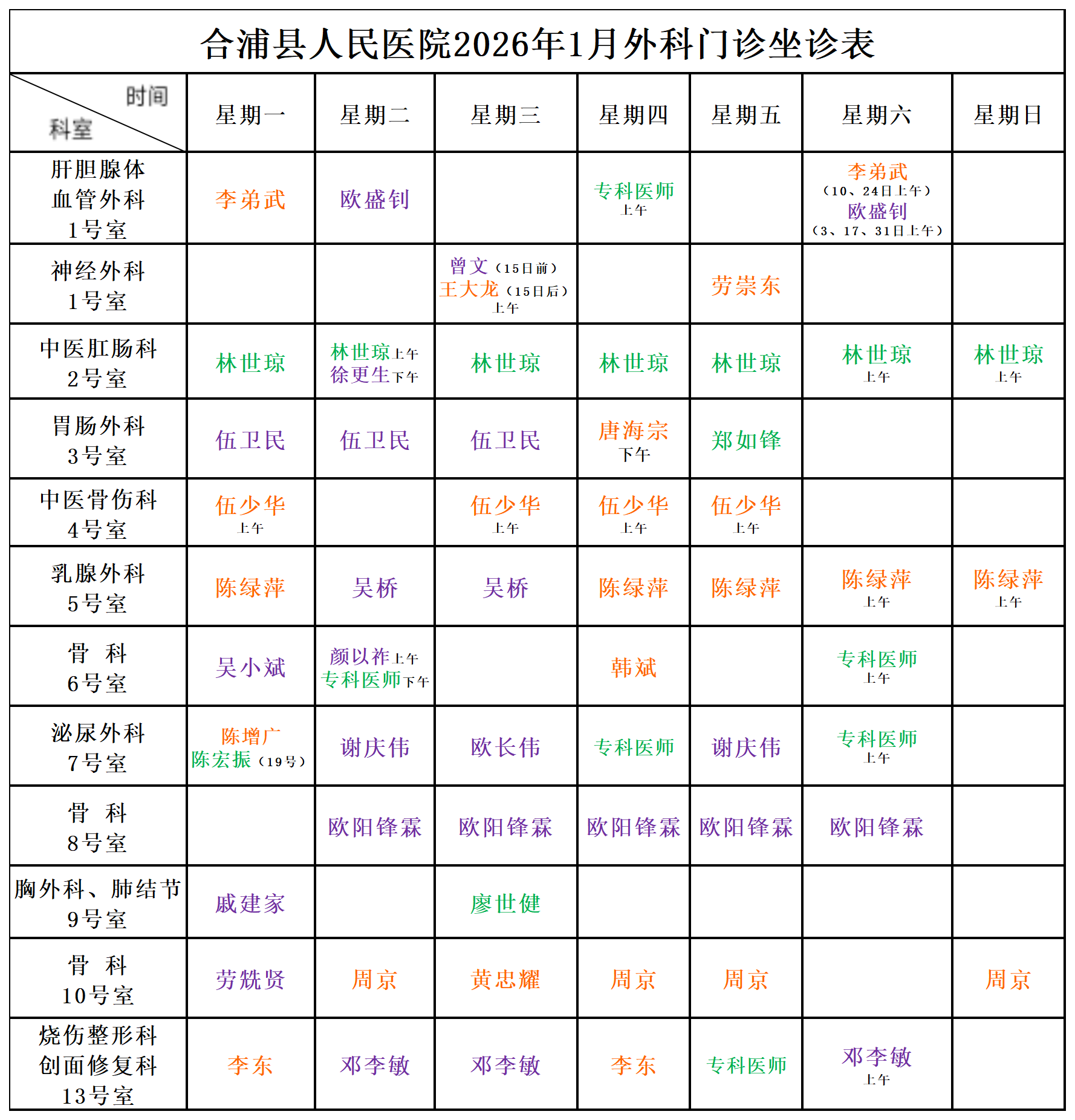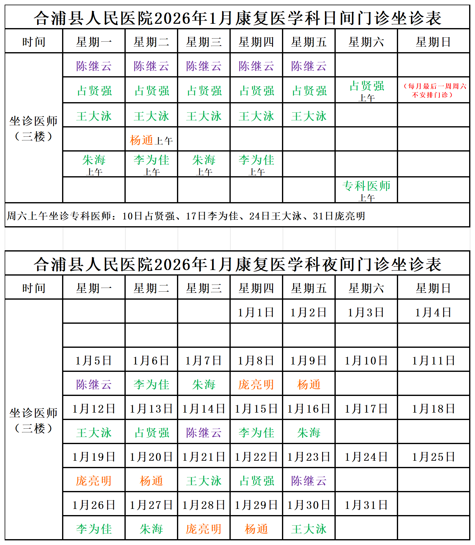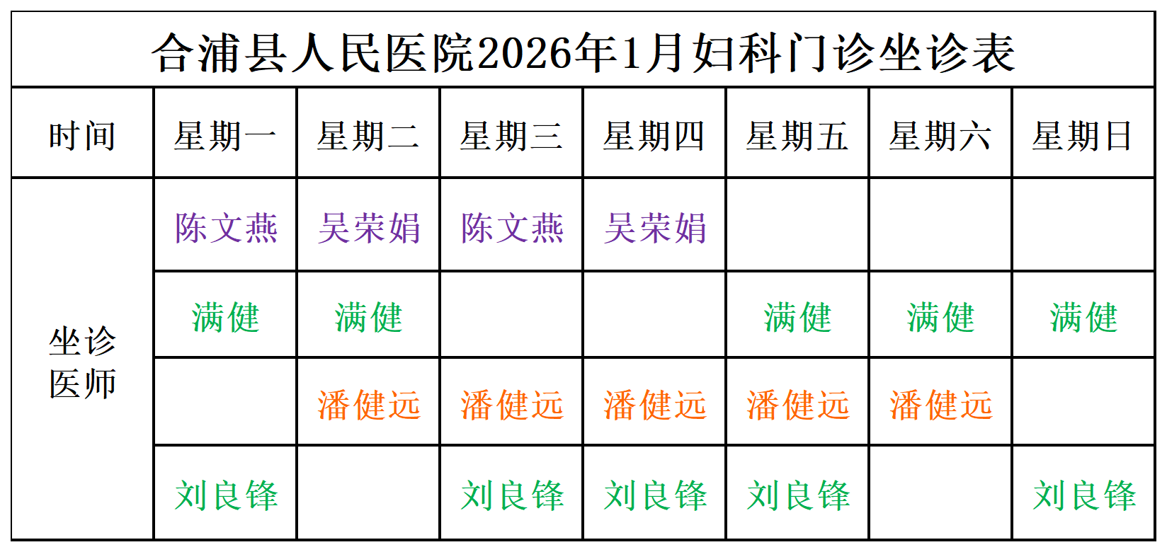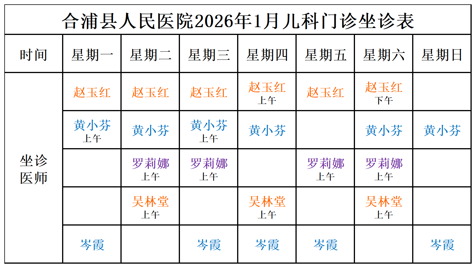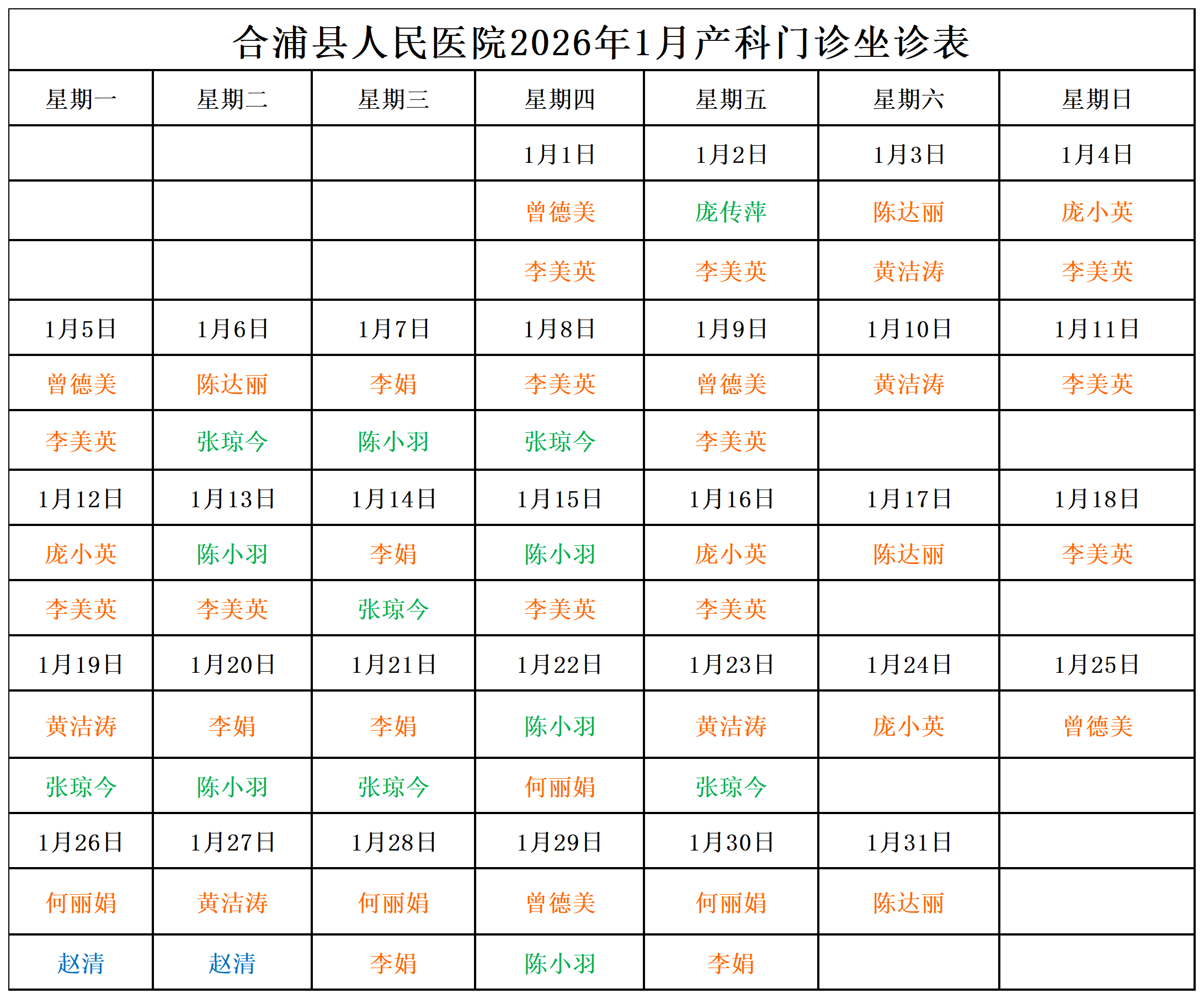 2026年1月门诊坐诊安排