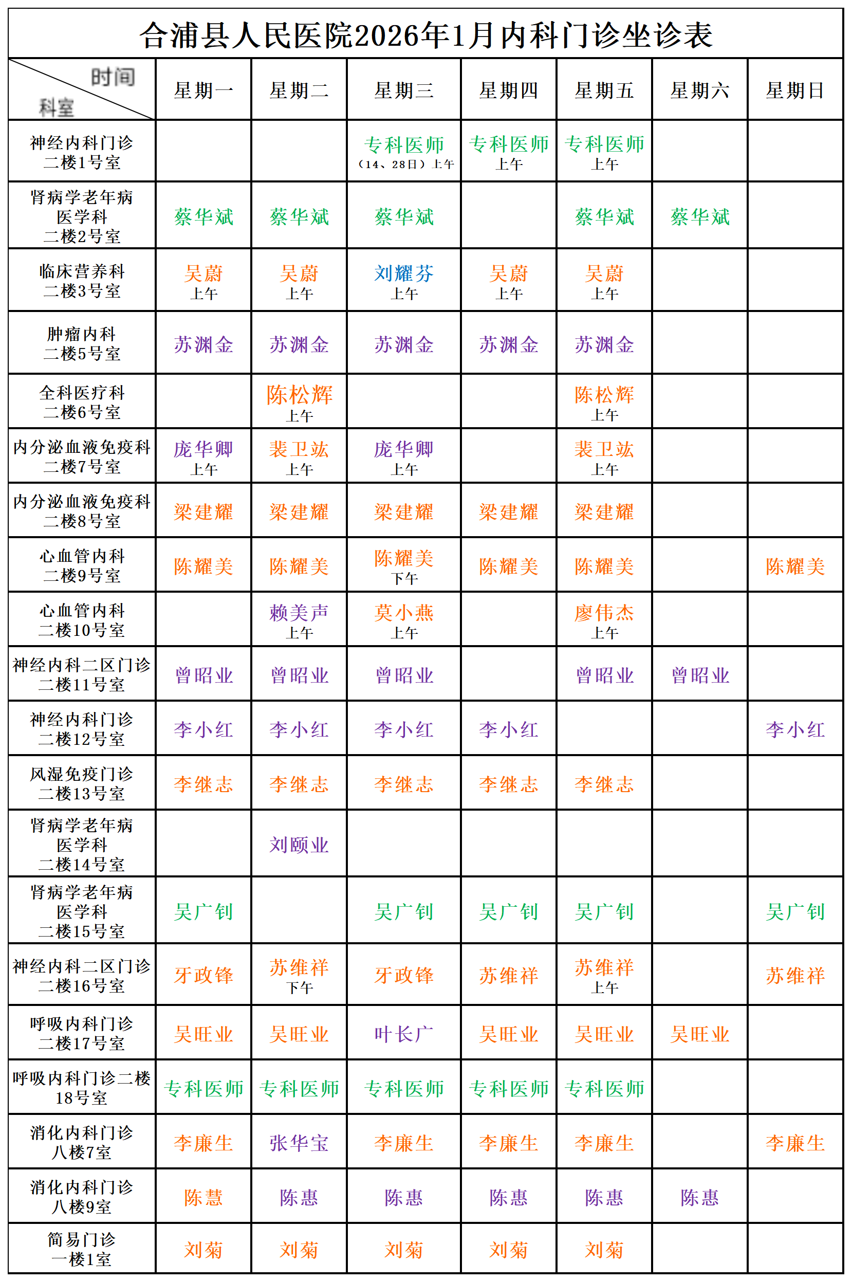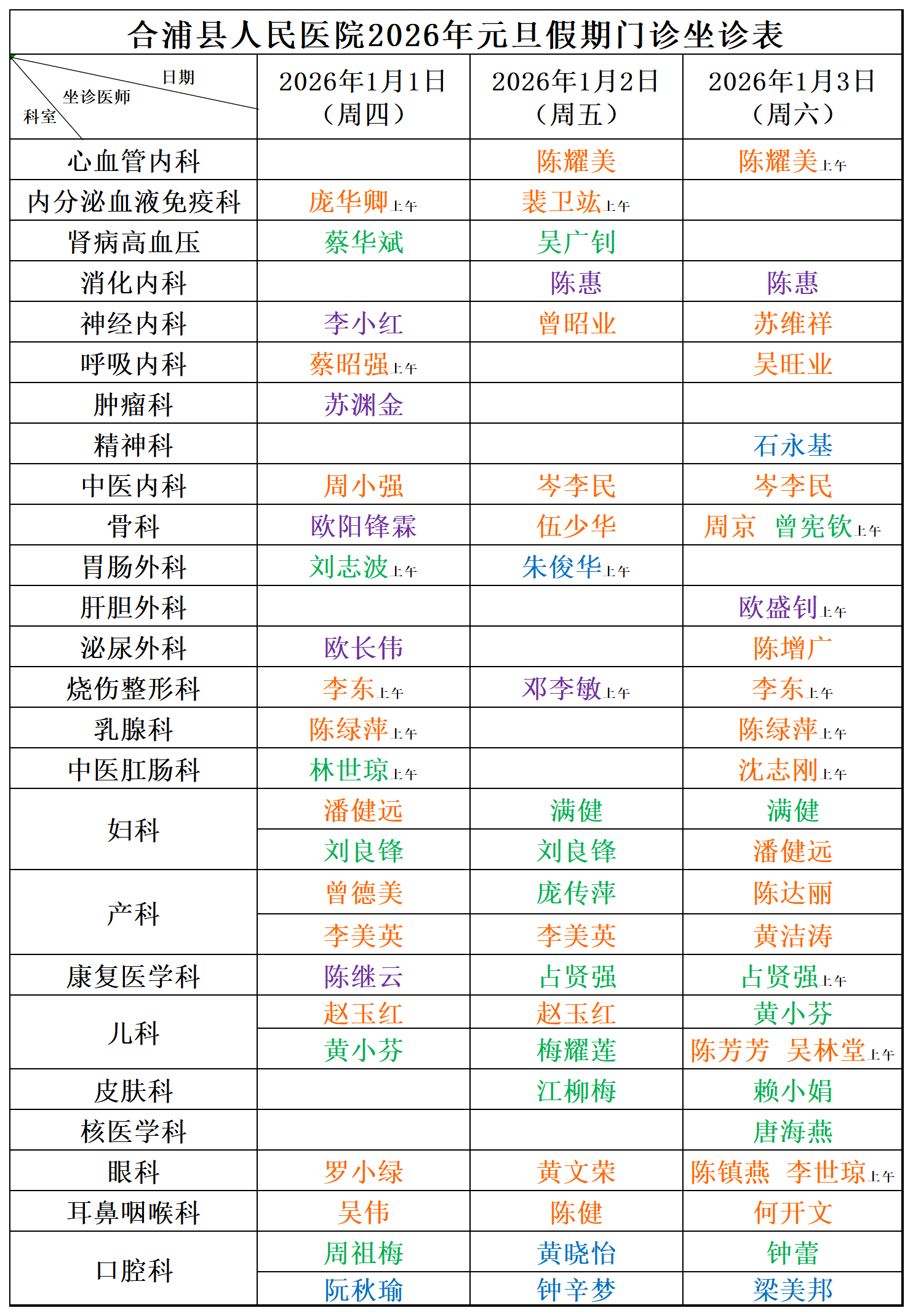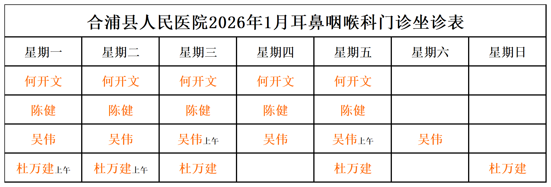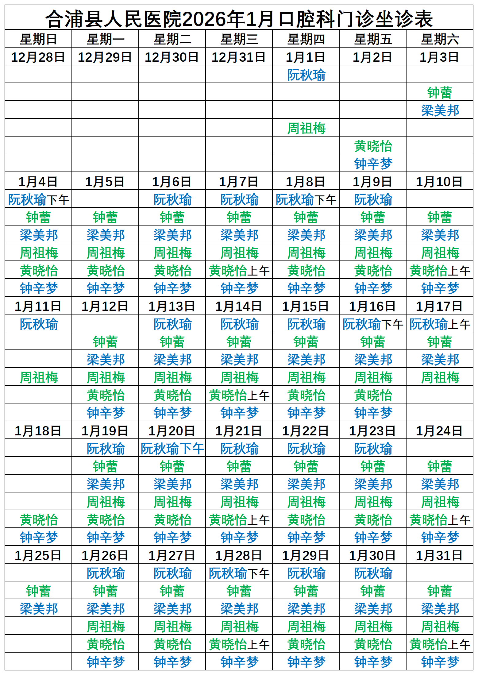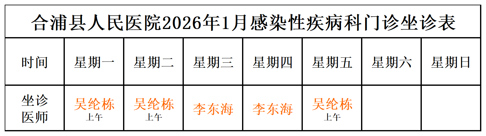2026年1月门诊坐诊安排