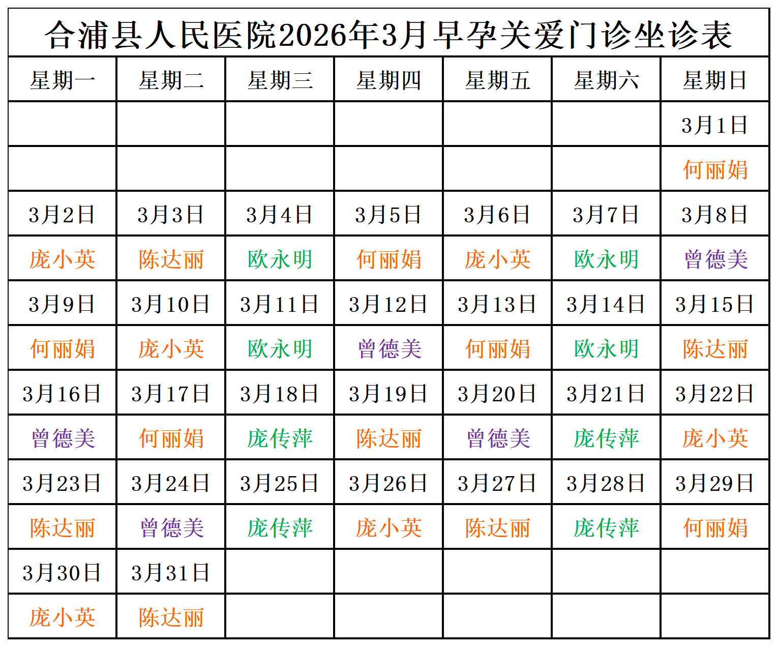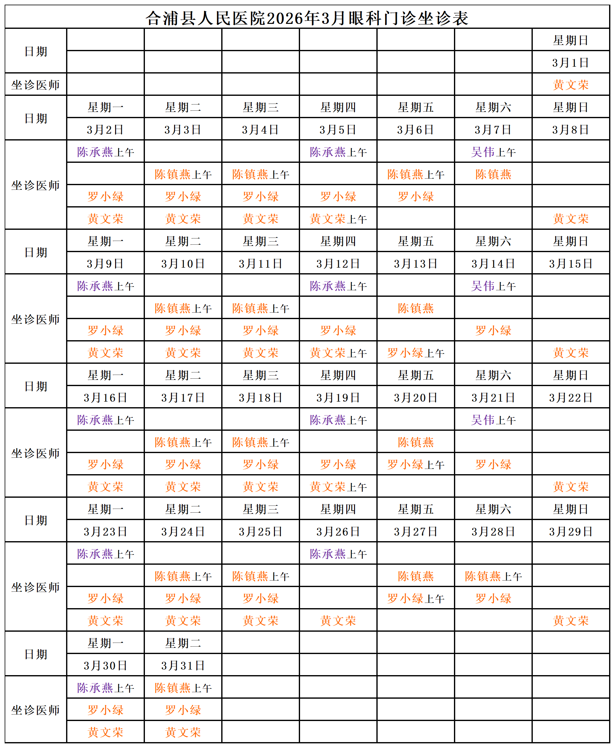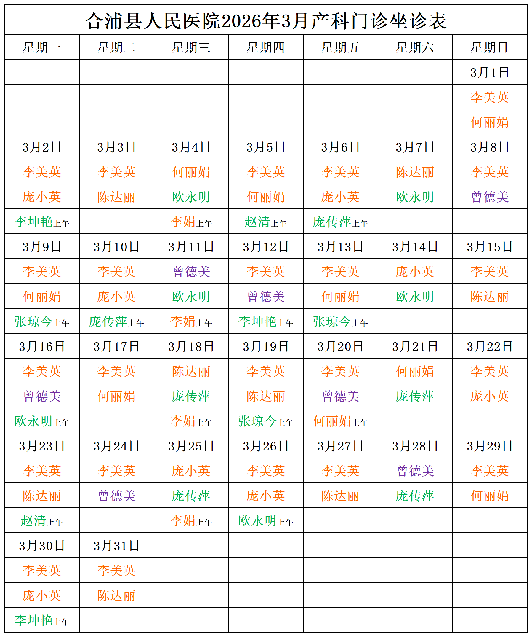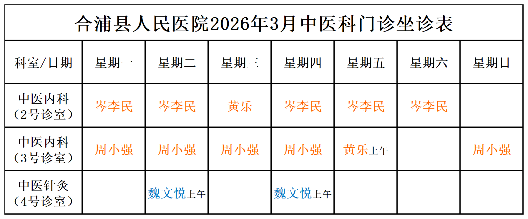 2026年3月门诊坐诊安排