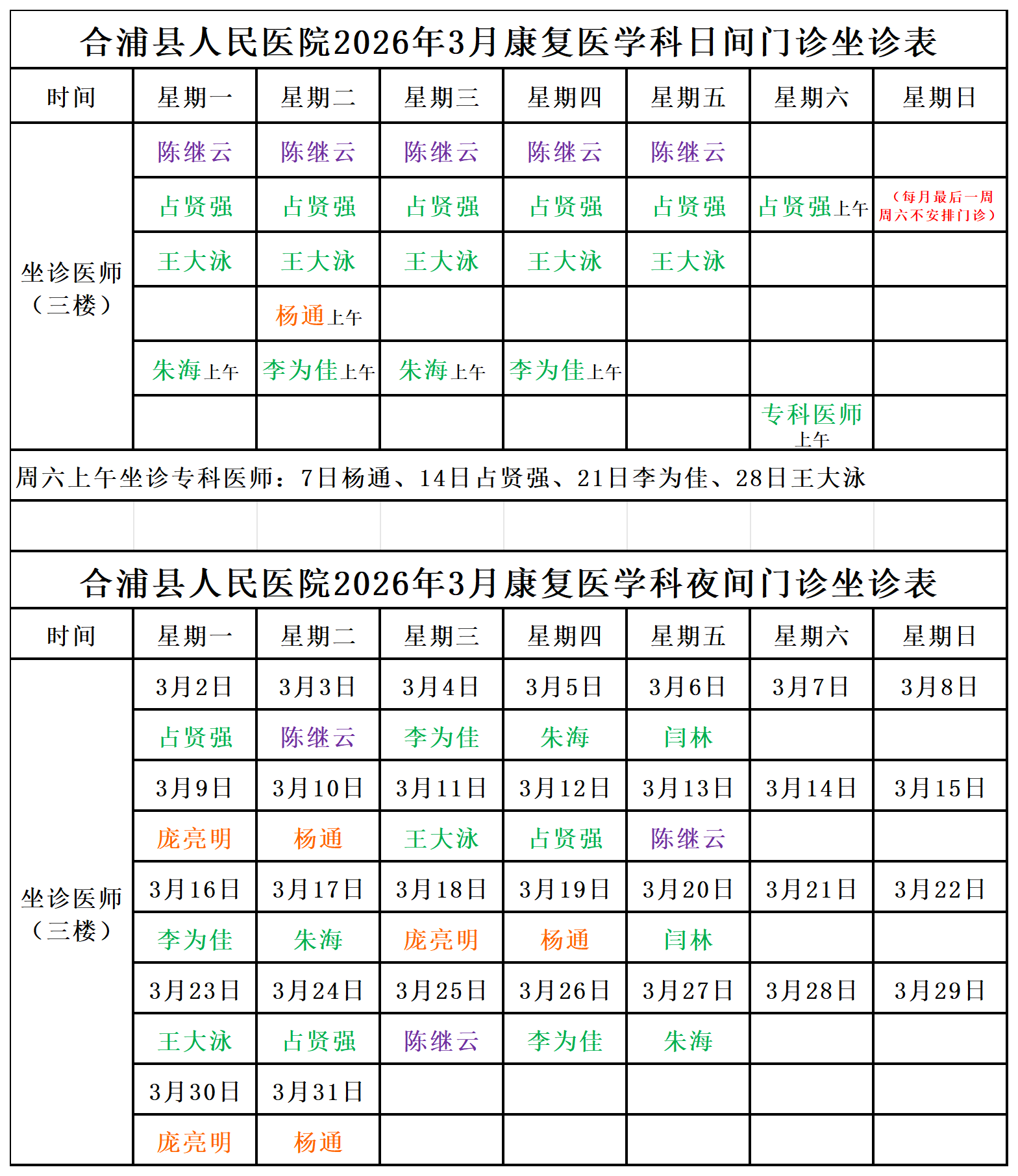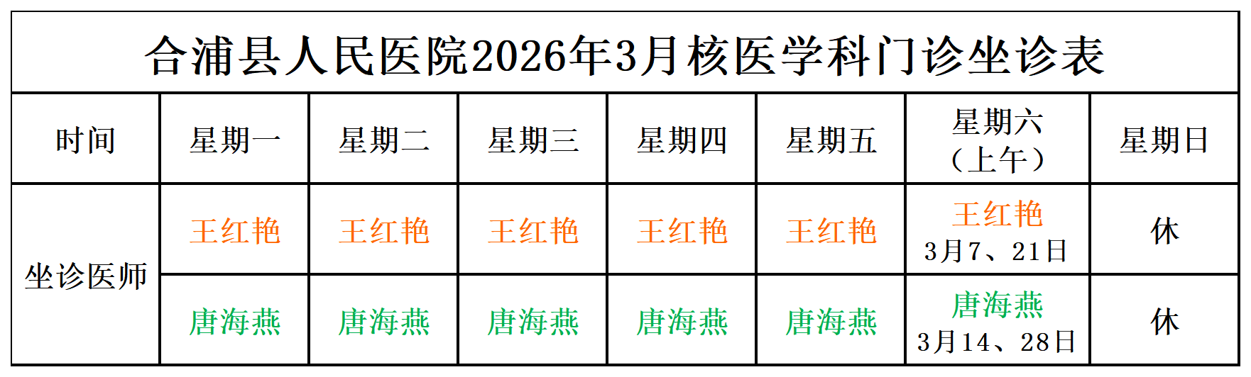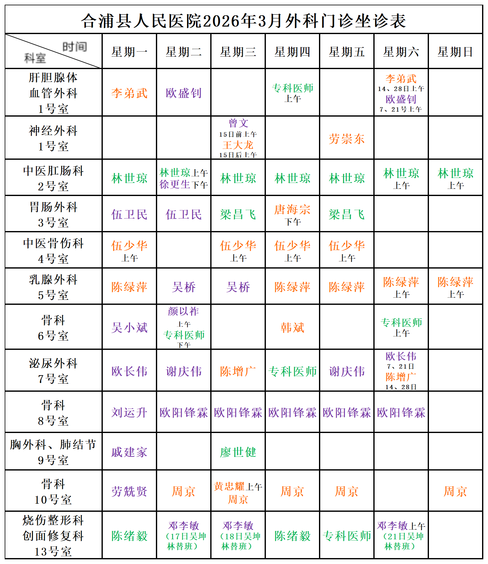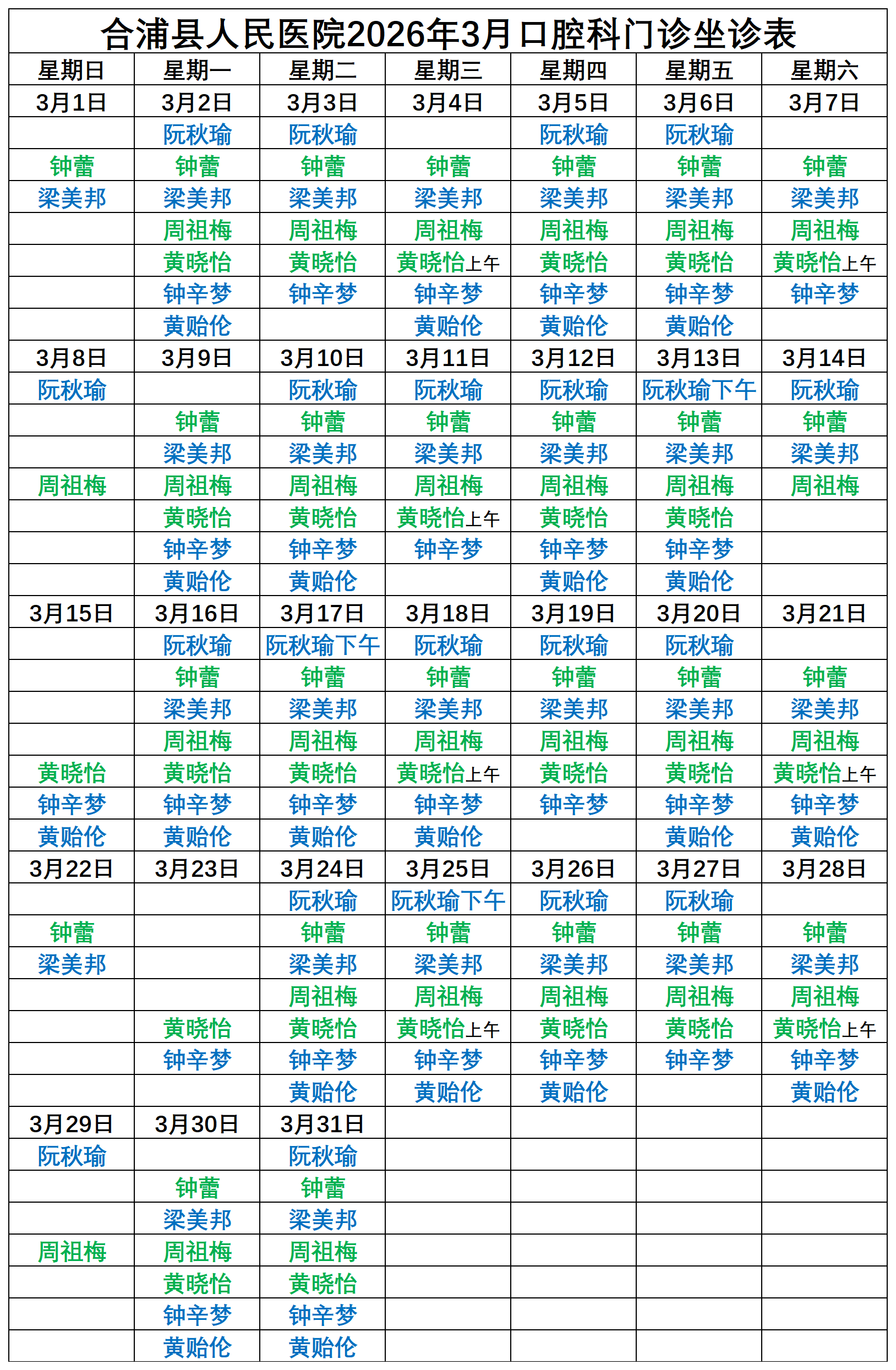 2026年3月门诊坐诊安排