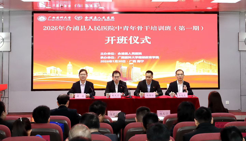 广西医科大学继续教育学院院长周波,我院党委书记赖天宁,党委副书记、院长陈敬松,党委副书记张天慧出席开班仪式并致辞,开班仪式由广西医科大学继续教育学院副院长韦先良主持。