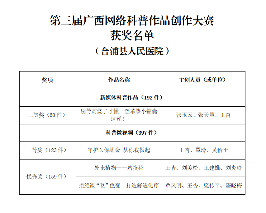 这些作品不仅展现了我院医务工作者扎实的专业功底和积极的创作热情,也彰显了医院在健康科普传播方面的积极探索与创新活力。此次获奖是对我院科普创作能力的充分肯定。今后,我院将继续鼓励和支持医务人员投身健康科普工作,创作出更多群众喜闻乐见、科学严谨的优质科普作品,为推动全民健康素养提升贡献力量。(文/王杏)